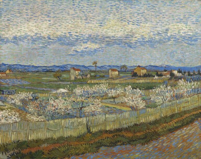 چه چیزی به اندازه گل های سفید نرم درختان شکوفه زده بهاری بیشتر شبیه به بهار است؟ در اوایل زندگی اش وینسنت ون گوگ پالت رنگی نسبتاً تیره و غم انگیزی داشت. اما همه چیز پس از اقامت او در پاریس در اواخر دهه ۱۸۸۰ تغییر کرد. در آنجا او با آثار امپرسیونیست ها و پست امپرسیونیست های اولیه آشنا شد. او همچنین فرصت پیدا کرد که تعدادی از چاپ های ژاپنی «اوکی یو-ئه» را خریداری کند. این تاثیر زیادی بر سبک او گذاشت. نقاشی های او روشن تر و رنگارنگ تر شدند. ون گوگ همچنین به خصوص جذب درختان شکوفه زده شد همانطور که در نقاشی هایی مانند «شکوفه درختان هلو» و یکی از آثار مشهورش «شکوفه های بادام» مشاهده می کنیم.